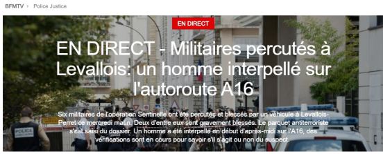 UPDATE H αστυνομία συνέλαβε τον ύποπτο άνδρα που παρέσυρε πολλούς στρατιώτες στην Levallois-Perret ανακοινώνει το BFM TV.