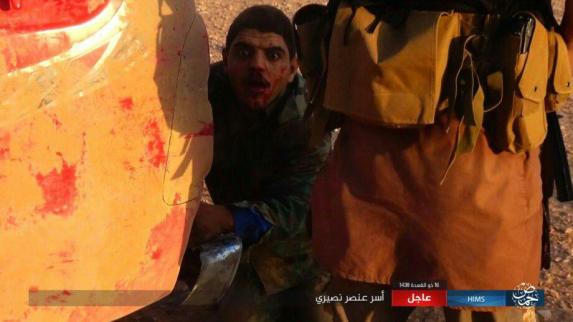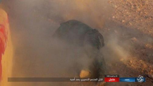 Η τρομοκρατική οργάνωση ISIS εκτέλεσε με καταιγισμό πυρών προφανώς αυτόματου όπλου αιχμάλωτο σύριο στρατιώτη στην επαρχία της Χομς σε περιοχές όπου ακόμη μαίνονται σφοδρές μάχες των τζιχαντιστών με συριακό στρατό και συμμάχους του.Η ανάρτηση από αξιόπιστη πηγή φέρει ημερομηνία ανάρτησης 11.8.17.Πρόκειται για ένα ακόμη άννδρο έγκλημα πολέμου των τρομοκρατών.