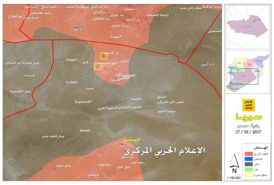 Σύμφωνα με τα μέσα αντίστασης ο συριακός στρατός κλείνει ολοένα και περισσότερο την ψαλίδα στα διοικητικά όρια της Ράκα με Χομς.Προελαύνοντας με τους συμμάχους του έθεσε υπό τον έλεγχό του μαι σειρά από σημαντικά υψώματα και χωριά : Tal Al-Yalef, Dahr Al-Salhouh, Al-Amali, Rjam Al-Sheheh, Suh Al-Dilij, Qirba, Wadi Al-Auj στα βόρεια της SUKHANH και στ΄ανατολικά της Χάμα.