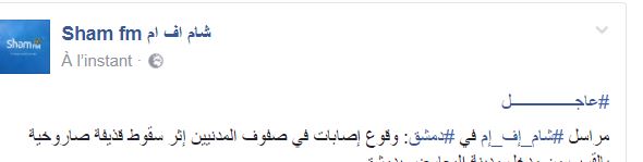Θύματα πολίτες από ρουκέτα που έπεσε κοντά στην είσοδο της 59ης Διεθνούς Έκθεσης της Δαμασκού μεταφέρει τώρα το Shamfm.Είχε παρατηρηθεί κοσμοσυρροή επισκεπτών από τη στιγμή που άνοιξε η Έκθεση.