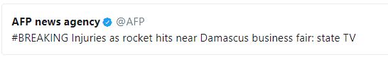 Αρκετοί τραυματίες από ρίψη ρουκέτας κοντά στην επιχειρηματική Έκθεση Δαμασκού αναφέρει τώρα και το AFP επικαλούμενο την κρατική τηελόραση.