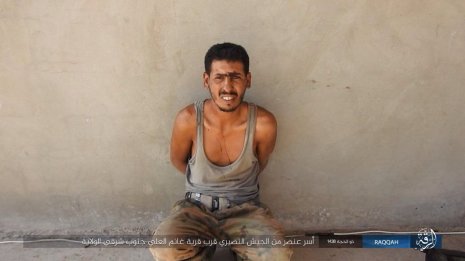 H ISIS δημοσιοποίησε φωτογραφία από σύριο στρατιώτη που διατείνεται ότι αιχμαλώτισε χθες στο κοντά στο χωριό Ghânim Al-‘Ali στα ΝΑ της επαρχίας Ράκα.Σύμφωνα με άλλες πηγές συριακά και ρωσικά μαχητικά βομβάρδισαν θέσεις των τρομοκρατών στο χωριό Ghânim Al-‘Ali.