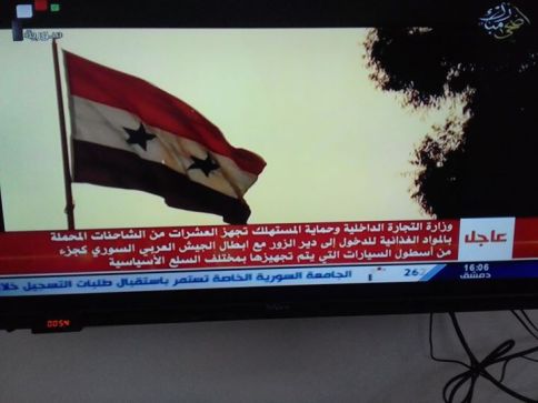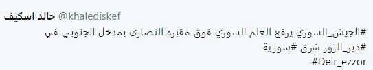Comme rapporte à 15h15 heure locale de Syrie, le journaliste de la chaine arabe Almayadeen , l’ armée syrienne a levé le drapeau national dans le cimetière chretien situé à l’ entrée sud de la ville de Deir Εzzor. L’ armée arabe syrienne est arrivée à la ville et le siège est brisé.
