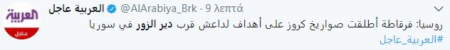 Όπως μεταδίδει τώρα μ΄έκτακτη ενημέρωση το κανάλι alarabiya tv μια ρωσική φρεγάτα εξαπέλυσε πυραύλους κρουζ κατά στόχων τρομοκρατών της ISIS κοντά στην πόλη της Deir al-Zour στη ΒΑ Συρία…..5.8.17