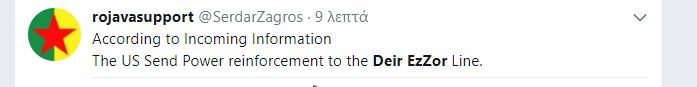 Σύμφωνα με κούρδικο λογαριασμό που επικαλείται πληροφορίες οι ΗΠΑ στέλνουν ενισχύσεις στη γραμμή του μετώπου στη Ντέιρ Έζζορ μετά το χτύπημα των ρωσικών και συριακών μαχητικών κατά θέσεων των SDF τη νύχτα κοντά στη βιομηχανική ζώνη.