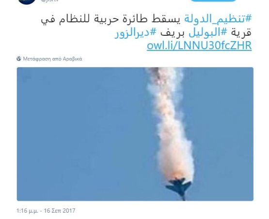 ISIS a abattu un avion syrien à Al Bukamal à l΄est de Deir Ezzor à rapporté hier la chaîne Al-Jisr, de soi-disant opposition, citant ses propres sources. De même, le soi disant observatoire syrien qui soutient aussi l”’opposition ” (SOHR) rapporte que l’ avion tombé à Al-Bukamal à l’est de DeirEzzor , était syrien.