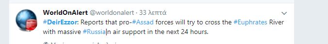 Πριν από λίγο διέρρευσε ότι υπάρχουν αναφορές ότι οι δυνάμεις του συριακού στρατού και οι σύμμαχοί τους θα επιχειρήσουν να διασχίσουν τον ποταμό Ευφράτη με τη μαζική αεροπορική ρωσική υποστήριξη εντός των επόμενων 24 ωρών.