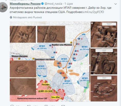 To ρωσικό Υπουργείο Άμυνας δημοσίευσε μια σειρά από αεροφωτογραφίες που δείχνουν εξοπλισμούς ειδικών αμερικανικών δυνάμεων επί θέσεων της Daesh στα βόρεια της Deir-ez Zor στη Συρία.