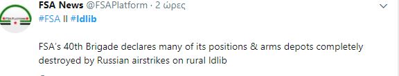 Στο πεδίο της μάχης έντονες αεροπορικές ρωσικές επιδρομές στην επαρχία του Ιντλίμπ σήμερα Σε μια από αυτές καταστράφηκαν πολλές θέσεις και αποθήκες όπλων της 40ης ταξιαρχίας του FSA στην ύπαιθρο του Idlib κατά δήλωση των ίδιων.