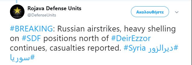 Πριν από λίγο 25.9.17 στον επίσημο λογαριασμό τους στο Twitter η κούρδικη πολιτοφυλακή People’s Defense Units (YPG) στην αυτοαποκαλούμενη ”Ομοσπονδία Rojava-Β Συρία” αναφέρουν συνεχείς ρωσικές αεροπορικές επιδρομές ,σκληρό βομβαρδισμό σε θέσεις των SDF στα βόρεια της Deir Ezzor και ότι υπάρχουν θύματα.