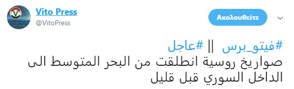 Σύμφωνα με το συριακό μέσο Vito Press τα μεσάνυχτα Σαββάτου προς Κυριακή ρωσικοί πυραύλοι εκτοξεύθηκαν από ρωσικό πλοίο από τη Μεσόγειο Θάλασσα κατά στόχων στο εσωτερικό της Συρίας.Δημοσιογράφος αναφέρει εκκωφαντικούς θορύβους πριν από λίγο στην Ταρτούς και πιστοποιεί από την πλευρά του την είδηση λέγοντας ότι πύραυλοι ρωσικοί πέρασαν πάνω από την Ταρτούς για να χτυπήσουν στόχους στο εσωτερικό της χώρας.