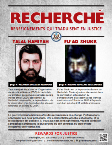Οι ΗΠΑ με τρόπο Γουέστερν αμοίβουν αδρά με 5 και 7 εκατομύρια dollars όποιον συλλάβει τον Talal Hamiyah και 2 από τους πιο δραστήριους διοικητές της Hezbollah, γνωστούς για τις πολεμικές επιδόσεις τους κατά της Daech και της πτέρυγας της Αλ Κάιντα στη Συρίας της al-Nosra σε Χαλέπι και συριακή έρημο.