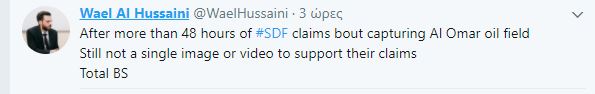 Φαίνεται ότι η κατάσταση είναι περίπλοκη.Άλλες πληροφορίες από δημόσιο πρόσωπο της Συρίας φέρουν μια από τις μεγαλύτερες φυλές της συριακής ερήμου που πολεμάει στις τάξεις της ISIS τα προηγούμενα 24ωρα να μπήκε ως δούρειος ίππος των αμερικανών με διακριτικά SDF στο πετρελαικό πεδίο….