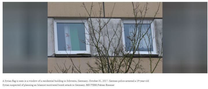 ΓΡΑΦΕΙ ΣΤΗ ΛΕΖΑΝΤΑ της φωτογραφίας που είναι στιγμιότυπο από τη γερμανική τηλεόραση:”A Syrian flag is seen in a window of a residential building in Schwerin, Germany, Oct. 31, 2017. (Photo: Reuters)”