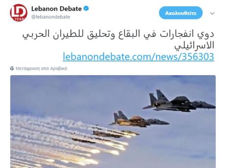 O ανταποκριτής του “Lebanon Debate” άκουσε επίσης ήχο εκρήξεων στη β Bekaa, συνοδευόμενο από πτήση ισραηλινών μαχητικών. Στόχευσαν συραικές θέσεις από το λιβανέζικο εναέριο χώρο.