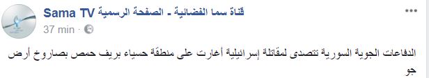 Το κρατικό δορυφορικό συριακό κανάλι sama αναφέρει ότι η συριακή αεράμυνα επιτέθηκε σε ισραηλινό μαχητικό με πύραυλο εδάφους αέρος στη Hasyaa.
