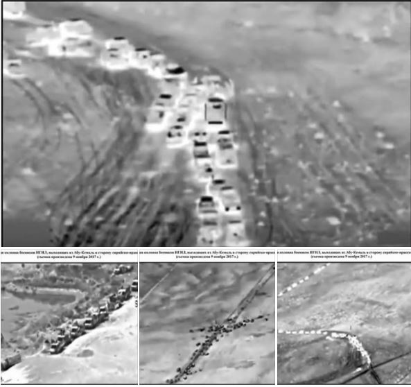 «Για την διασφάλιση ασφαλούς εξόδου στους μαχητές της Daech που αποσύρονταν από το Abou Kamal υπό τα πυρά των χτυπημάτων των κυβερνητικών δυνάμεων η αεροπορία της συμμαχίας αποπειράθηκε να εμποδίσει τα στρατιωτικά ρωσικά αεροπλάνα να επιχειρούν στην περιοχή. Τα μαχητικά της συμμαχίας μπήκαν στον εναέριο χώρο στα 15 km πάνω από τη ζώνη γύρω από το Abou Kamal για να εμποδίσουν τη δουλειά των ρωσικών αεροσκαφών», ανέφερε το υπουργείο.