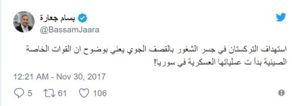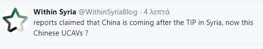 “Η στόχευση του Turkistan [TIP] in Jisr al-Shughur από αεροπορικό βομβαρδισμό εμφανώς υποδηλώνει ότι οι κινέζικες ειδικές δυνάμεις άρχισαν τις στρατιωτικές τους επιχειρήσεις στη Συρία!” γράφει ο Jaara στο twitter.