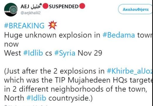 Mια τεράστια έκρηξη που σημειώθηκε από άγνωστη αιτία προκλήθηκε στην πόλη Bedama πριν από λίγο νύχτα 29ης Νοέμβρη στα δυτικά του Idlib.