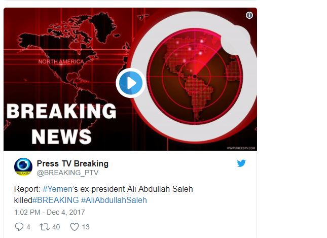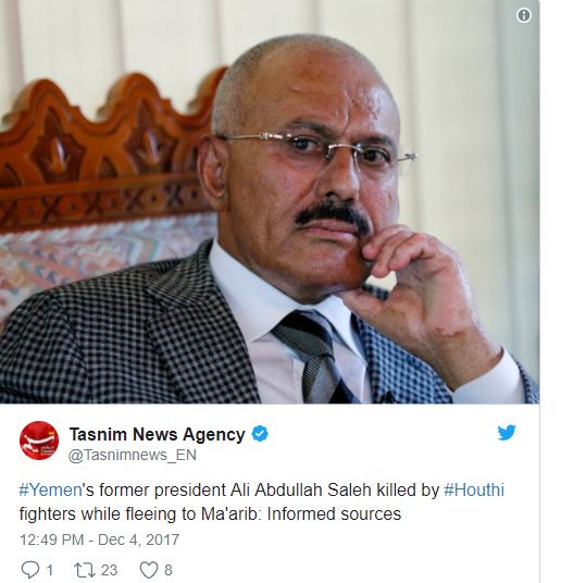 Το ιρανικό επίσης (MNA) αναφέρει ότι ο Ali Abdullah Saleh ενώ επιχειρούσε να διαφύγει από την πρωτεύουσα Sana’a, με θωρακισμένο όχημα όταν τον σκότωσε η συμμαχία των Σαουδαράβων μαζί με τον αντιπρόεδρο του Aref Zoka και το ΓΓ του National Congress Party τον Yaser al-Awazi.