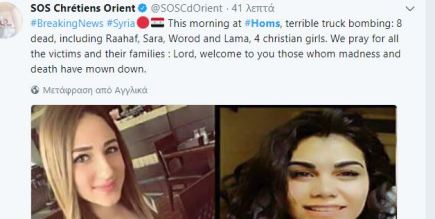 Η οργάνωση SOS Chrétiens Orient επιβεβαιώνει ότι το θάνατο 4 χριστιανών φοιτητριών στο σημερινό χτύπημα στη Χομς. Kαι χριστιανικές συριακές σελίδες μιλούν για 4 χριστιανές κοπέλες που σκοτώθηκαν.