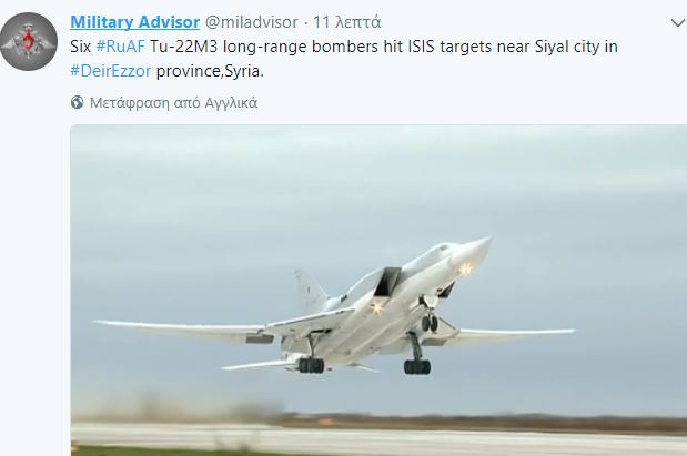 Ανακοινώθηκε ότι 6 ρωσικά στρατηγικά βομβαρδιστικά Tu-22M3 χτύπησαν στόχους της ISIS πλησίον της πόλης Siyal στο κυβερνείο της Deir Ezzor στη Συρία.