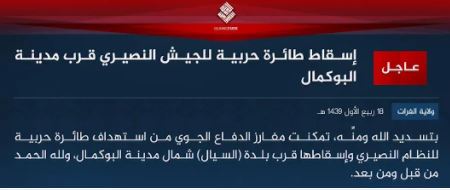 Στις 6 Δεκέμβρη οι τρομοκράτες της ISIS κατέρριψαν ένα συριακό μαχητικό με ένα απροσδιόριστο “ανατιαρεπορικό” στο χωριό Tasel βόρεια της πόλης al-Bukamal στη ΝΑ περιφέρεια της Deir Ezzor σύμφωνα με το πρακτορείο της ISIS το Amaq.Σε κάθε περίπτωση πηγές φιλοκυβερνητικές και της ”αντιπολίτευσης” διαψεύδουν τους ισχυρισμούς της Amaq και σημειώνουν ότι το Tasel απελευθερώθηκε νωρίτερα από (SAA) και συμμάχους του.southfront 7.12.17
