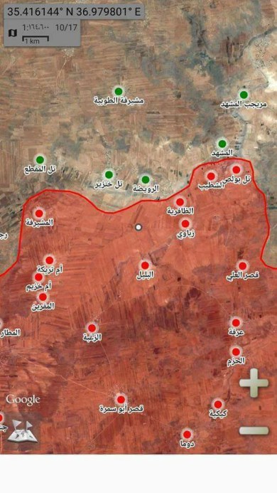 Προελαύνει ο συριακός στρατός στο νότο της επαρχίας του Idlib.Έθεσε υπό τον έλεγχό του ήδη τα πρώτα 5 χωριά και υψώματα και προωθείται πάντα προς την κατεύθυνση του στρατιωτικού αεροδρομίου Abu Duhur.O στρατός απελευθέρωσε από την ΗΤS (Hay’at Tahrir al-Sham τ.Αλ Νούσρα) συνολικά επιπρόσθετα μια επιφάνεια 25 km² και τα χωριά Um Khuzaym, Um Turaykiyah, Rujm Ahmar, Mushayrifah, Shutayb και μεταξύ άλλων και το ύψωμα Tal Boulas.Aξιόπιστη πηγή αναφέρει ότι σήμερα το πρωί ο στρατός προελαύνει στο Ν και στα ΝΑ της επαρχίας του Ιντλίμπ αυτό σημαίνει ότι η μεγάλη μάχη κατά της al-Nosra, άρχισε.