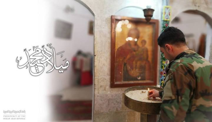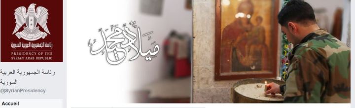 H επίσημη σελίδα facebook της συριακής προεδρίας την ημέρα των Χριστουγέννων έβαλε στο εξώφυλλο μια φωτογραφία με ένα σύριο στρατιώτη που προσεύχεται μπροστά σε μια ορθόδοξη εικόνα της Παναγίας σε στάση Βρεφοκρατούσας κι ανάβει ένα κερί……