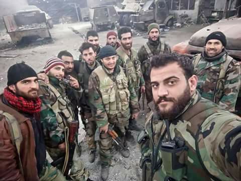 Στην φωτογραφία ο στρατηγός Nizar Fendi με την 9η Ταξιαρχία των Μαύρων του Δημοκρατικού Στρατού στο πεδίο της μάχης στη Harasta ενώ προετοιμάζονται για την άρση της πολιορκίας της Βάσης Τεθωρακισμένων.