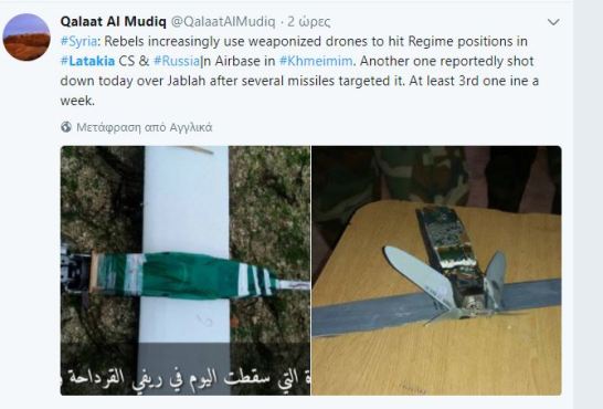 Πηγή της αντιπολίτευσης επιβεβαιώνει το βραδυνή επίθεση στη βάση: οι ”αντάρτες” χρησιμοποιούν όλο και πιο συχνά επανδρωμένα με οπλικά στυστήματα drones για να χτυπήσουν θέσεις του στρατού στη Λαττάκεια και το αεροδρόμιο της Khmeimim. Ένα άλλο καταρρίφθηκε σήμερα στη Jableh αφού το στόχευσαν με πολλούς πυραύλους. Είναι τουλάχιστον το τρίτο αυτή τη βδομάδα.