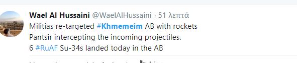 Ο συναγερμός ακούγεται στο αεροδρόμιο της Hamimim τώρα και τ΄αντι-αεροπορικά βάλουν.
