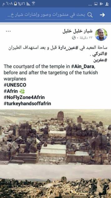 Τουρκικά αεροπλάνα βομβάρδισαν έναν πολύ σημαντικό αρχαιολογικό χώρο στην Aïn Dara στη Β Συρία στην περιοχή του Αfrin και προκάλεσαν μεγάλες καταστροφές στο ναό που περιλαμβάνει. Πρόκειται για τον χώρο γνωστό ως Kinalua (στην εποχή του σιδήρου) – kunulua (στην εποχή hittite) – Gindaros (στην ελληνιστική εποχή).