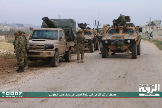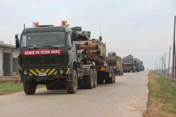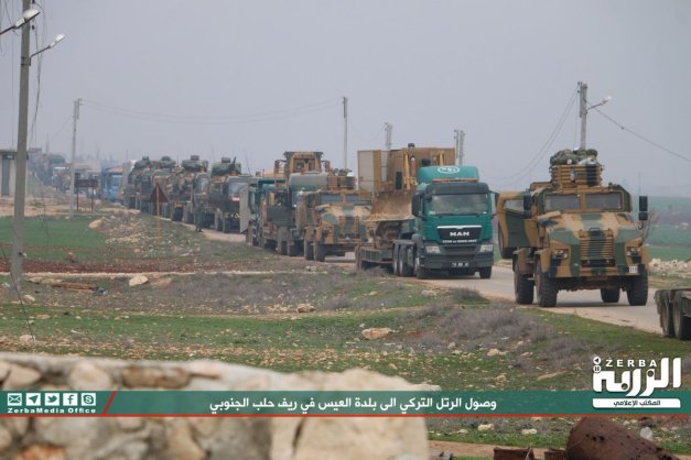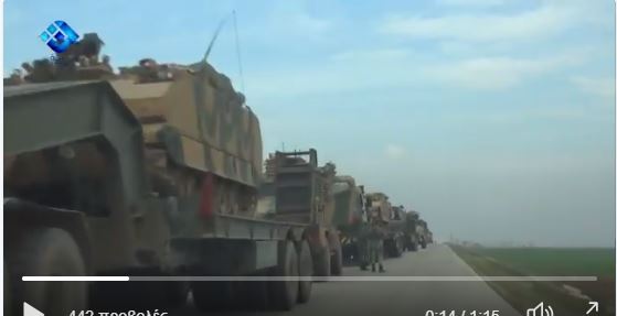 Ένα μεγάλο στρατιωτικό τουρκικό κομβόι αποτελούμενο από περίπου 100 οχήματα μεταξύ αυτών και τεθωρακισμένα μπήκε σήμερα το πρωί σε συριακό έδαφος από το συνοριοπέρασμα Kafrulusin στο Idlib.Προχώρησε και έφτασε στο στρατηγικό ύψωμα al Eis στο Ν Χαλεπίου . Η εφημερίδα Daily Turk ανέφερε ότι το τουρκικό κομβόι που μπήκε σήμερα το πρωί στη Β Συρία κατευθύνεται προς τη δημιουργία ενός έκτου σημείου επιτήρησης βάσει μιας διεθνούς συμφωνίας για τη δημιουργία ”ζωνών αποκλιμάκωσης”.