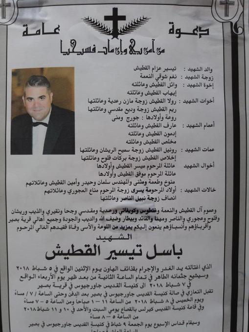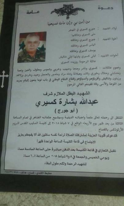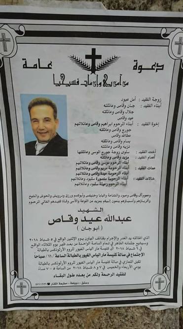 Αναφέρονται 2 θύματα χριστιανοί.Πρόκειται για τον Bassel Qutish με καταγωγή από το χωριό Al-Dulayya, που σκοτώθηκε από ρουκέτα που έπεσε στο γραφείο Al-Daila στην Sheikh Raslan περιοχή.Ο δεύτερος είναι ο Abdullah Bash με την κωδική ονομασία Αbu George o πατέρας του Γιώργου που ήταν μέλος της εθνικής άμυνας στη Δαμασκό που σκοτώθηκε επίσης από ρουκέτα.