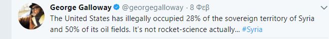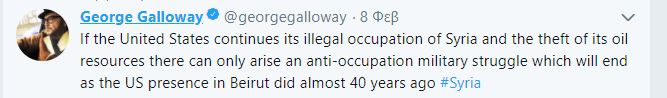 Ο βρετανός πολιτικός- βουλευτής George Galloway σε συνεχόμενα twitter τάσεται ανοιχτά κατά της αμερικανοκουρδικής συμμαχίας και κατοχής στο Β της Συρίας με αφορμή τον βομβαρδισμό από ΗΠΑ συριακών θέσεων στη Ντέιρ Εζζορ.Στις 8.1.18 γράφει
