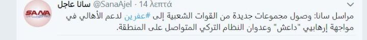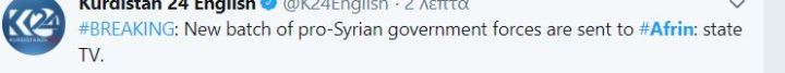 Σύμφωνα με το συριακό πρακτορείο sana νέες ενισχύσεις Μονάδων Εθνικής Άμυνας έφθασαν τώρα στο Αφρίν για ν΄αντιμετωπίσουν την τουρκική επίθεση. Αναφορές άλλων πηγών κάνουν λόγο για πολλές φιλοκυβερνητικές συριακές μονάδες που μπαίνουν τώρα στο Αφρίν. Το Kurdistan 24 επικαλείται τη συριακή τηλεόραση και αναφέρει ότι νεά παρτίδα φιλοκυβερνητικών συριακών δυνάμεων αποστέλλονται στο Αφρίν σύμφωνα με τη συριακή κρατική τηλεόραση.Ενώ και το al Mayadeen μεταδίδει την είδηση. Από τους ελαιώνες του Αφρίν εξού και Κλάδος Ελαίας η επιχείρηση της τούρκικης εισβολής σύριος πολεμικός ρεπόρτερ μεταδίδει τώρα τις εξελίξεις. To Reuters μεταδίδει τώρα ότι συριακές δυνάμεις αρχίζουν να μπαίνουν στο Αφρίν προερχόμενες από Χαλέπι.