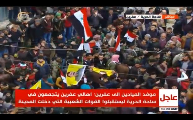 Οι συριακές συνάμεις υπό επευφημίες μπήκαν στην πόλη του Αφρίν στην κεντρική πλατεία της πόλης στην πλατεία Ελευθερίας.Υψώθηκαν συριακές σημαίες και πορτραίτα του Άπο και του Άσαντ αναφέρει και το κουρδικό Rudaw που μιλάει για διαμαρτυρίες και διαδήλωση κατά της τουρκικής εισβολής.