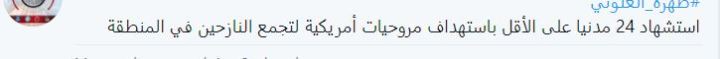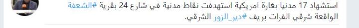 Τουλάχιστον 24 άμαχοι σκοτώθηκαν από βομβαρδισμούς αμερικανικών ελικοπτέρων που έπληξαν καταυλισμό εκτοπισμένων στην περιοχή στο Dhahra al-Αlouni στην ανατολική έρημο της Deir al-Zour αναφέρει τώρα δημοσιογράφος του al manar.Είναι μια νέα σφαγή στο ίδιο στρατόπεδο προσφύγων αφού το Σάββατο οι αμερικανοί και πάλι με μαχητικά της διεθνούς συμμαχίας βομβάρδισαν και σκότωσαν 25 άτομα σύμφωνα με το sana 18 σύμφωνα με την ίδια δημοσιογραφική πηγή του al manar.