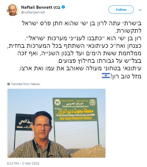 O ισραηλινός δημοσιογράφος Ben Jishai επισκέφθηκε την Deir Ezzor πριν από την απελευθέρωσή της από τους τρομοκράτες του Ισλαμικού κράτους. Ο Ισραηλινός Υπουργός Παιδείας Νaftali Bennet τον συγχαίρει μέσω του Twitter του και ένας στρατιωτικός αναλυτής σε ισραηλινή εφημερίδα περιέγραψε τον δημοσιογράφο ως πρώην αλεξιπτωτιστή που συμμετείχε σε πολέμους … Ο Ben Yishai έβγαλε αυτή την επίμαχη φωτογραφία κοντά στο Κέντρο Ερευνών στην επαρχία Deir Ezzor πριν απελευθερωθεί από την Daesh. Αυτό επιβεβαιώνει τη συνεργασία και τον συντονισμό μεταξύ της τρομοκρατικής οργάνωσης και των ισραηλινών μηχανισμών.
