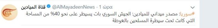 Όπως μεταφέρει το παναραβικό κανάλι Αl Mayadeen πριν λίγο επικαλούμενο πηγή από το πεδίο της μάχης ο συριακός στρατός ελέγχει σχεδόν το 40% της περιοχής της Ανατολικής Γκούτα που την είχαν κυριεύσει οι τρομοκράτες.Με άλλα λόγια ο στρατός απελευθέρωσε σε αυτήν την καταιγιστική του επιχείρηση περίπου το μισό της Ανατολικής Γκούτα τo τελευταίο μεγάλο προπύργιο και οχυρό των τρομοκρατών στη Συρία.