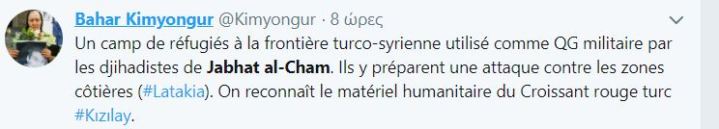 ΄Ενας καταυλισμός προσφύγων στα τουρκοσυριακά σύνορα χρησιμοποιήθηκε ως στρατιωτικό διοικητήριο από τους τζιχαντιστές της τρομοκρατικής οργάνωσης Jabhat al-Cham. Αυτοί προετοίμαζαν μια επίθεση κατά των παράκτιων ζωνών στην Λατάκεια.Στον καταυλισμό υπάρχει υλικό ανθρωπιστικής βοήθειας του τούρκικου Ερυθρού Σταυρού Kizilay.