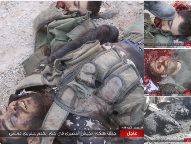 Η ISIS αποκεφάλισε αρκετούς σύριους στρατιώτες στο νότο της Δαμασκού στη συνοικία al-Qadam κοντά στον καταυλισμό προσφύγων Yarmouk που κατά πλειοψηφίαν ελέγχει.Χτύπησε ένα συριακό τανκ.Η ISΙS επιχειρεί να στείλει ένα μήνυμα στους λοιπούς τρομοκράτες της Ανατολικής Ghouta καλώντας τους να παραμείνουν σταθεροί παρά την άσχημη εξέλιξη που έχει πάρει γι αυτούς η κατάσταση εκεί.Η ISIS επιτέθηκε στη συνοικία Al-Qadam. Και διέδωσε ένα βίντεο που πιστοποιεί ότι προκάλεσε ένα πλήγμα στο στρό εκεί σκοτώνοντας περίπου δώδεκα στρατιώτες.