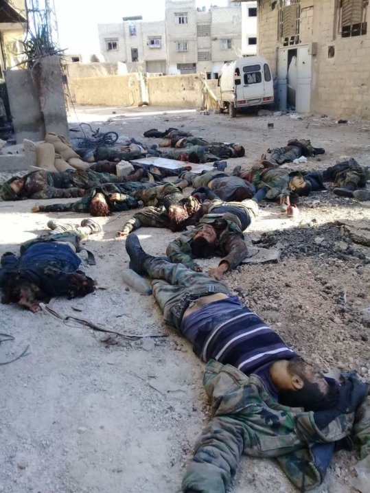 Παράλληλα φιλοκυβερνητικές πηγές αναφέρουν ότι στην περιοχή Al-Qadam αυτό που συμβαίνει είναι πολύ άσχημο και ότι σκοτώθηκαν τουλάχιστον 110 σύριοι στρατιώτες από την ISIS χωρίς να υπολογίζονται σε αυτούς οι εξαφανισθέντες και αιχμάλωτοι.Το ξέσπασμα της ISIS σχετίζεται και με το γεγονός ότι επιχειρεί να μετριάσει τις εντυπώσεις από την περιοδεία του ΄Ασαντ στο βάθος της Α Γκούτα χθες.Στην ίδια περιοχή σφαγιάστηκαν κι αποκεφαλίστηκαν από την ISIS πριν 2 μέρες τουλάχιστον 12 σύριοι στρατιώτες.Επίσης επιχειρείται αντιπερισπασμός στις συριακές δυνάμεις που είναι στην τελική φάση της απελευθέρωσης όλης της Α Γκούτα και μετριασμός των εντυπώσεων αυτής της μεγάλης επιτυχίας. Πολλοί συριακοί λογαρισμοί στο προφίλ στο fb έχουν τώρα μαύρο φόντο για την εξέλιξη αυτή. Οι σύριοι στρατιώτες μπήκαν στη ζώνη μετά την εκκένωση της από τρομοκράτες που εκκενώθηκαν.