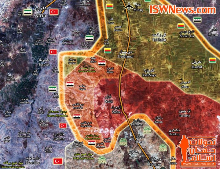 Από την άλλη η προσέγγιση των τουρκικών δυνάμεων στις πόλεις Nubl και Zahras και η πιθανότητα της μερικής παγίδευσής τους έκανε τη νεολαία των 2 αυτών πόλεων ,να ενωθεί με το συριακό στρατό στα γειτονικά χωριά όπως Burj al Qas, Miyasa, Aqibah, Bashamra, Calota, Zoq al Kabir για να δημιουργηθεί μια ζώνη ασφαλείας γύρω από τις Nubl ,Zahra για να σταματήσει η τουρκική εισβολή.