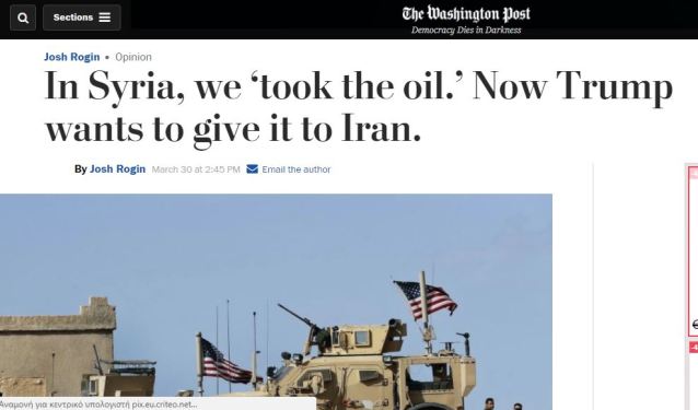 Η washingtonpost 30.3.18 ομολογεί με απόλυτο κυνισμό και ξεδιάντροπα ότι ο πόλεμος στη Συρία ήταν ένας ακόμη ιμπεριαλιστικός πόλεμος των αμερικανών για να λεηλατήσουν μετά τη Λιβύη και το Ιράκ και τις πλουτοπραγωγικές πηγές της Συρίας όπως θέλουν να βάλουν στο χέρι και το πετρέλαιο της Βενεζουέλας. « Στη Συρία εμείς πήραμε το πετρέλαιο τώρα ο Τραμπ θέλει να το δώσει στο Ιράν »….. αναφέρει τίτλος άρθρου. Στη συνέχεια υποστηρίζει με σαρκασμό και δηλητήριο κατά της ταπεινωτικής αναγγελίας του προέδρου των ΗΠΑ στο Οχάιο ότι θ΄αποσύρει σύντομα τους 2.000 αμερικανούς στρατιώτες από τη Συρία πως υπάρχουν πολλά καλά επιχειρήματα για τη διατήρηση της αμερικανικής παρουσίας στη Συρία μετά την ήττα του Ισλαμικού Κράτους αλλά ο πρόεδρος Τrump δεν φαίνεται πεπεισμένος για κανένα από αυτά.Ίσως θα μπορούσε, συνεχίζει να πάρει πίσω την προτροπή του τονίζει να κόψει και να φύγει αν γνώριζε ότι οι ΗΠΑ και οι εταίροι τους ελέγχουν σχεδόν όλο το πετρέλαιο.Κι αν οι ΗΠΑ φύγουν αυτό το πετρέλαιο θα πέσει στα χέρια του Iran αναφέρει σε τραγικούς τόνους η εφημερίδα. Ο έλεγχος του πετρελαίου είναι η μόνη επιρροή που έχουμε στη Συρία σήμερα , προσθέτει.