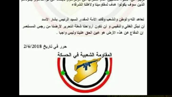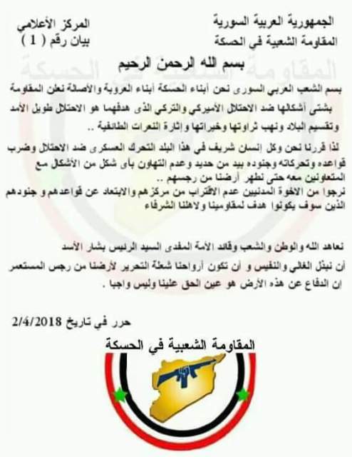Νέα φιλοκυβερνητική οργάνωση ιδρύθηκε “Η Λαική Αντίσταση της Al-Hasakah” με στόχο δράσεις σαμποτάζ κατά αμερικανικής και τούρκικης κατοχής στη Β Συρία.