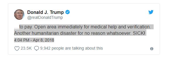 Στο Twitter ο αμερικανός πρόεδρος έγραψε “Πολλοί νεκροί συμπεριλαμβανομένων, γυναικόπαιδων, σε ανόητη χημική επίθεση στη Συρία. Η περιοχή της ακρότητας είναι κλειδωμένη και περικυκλωμένη από το συριακό στρατό ,καθιστώντας την ολοκληρωτικά απρόσιτη στον έξω κόσμο. Ο πρόεδρος Putin, η Ρωσία και το Ιράν ευθύνονται για την υποστήριξη στο ζώο Assad. Μεγάλο το τίμημα …..θα πληρώσεις.”