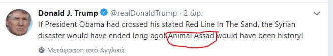 Και συνέχισε στο Twitter ότι αν ο πρόεδρος Ομπάμα είχε καθορίσει την κόκκινη γραμμή του στην Άμμο η συριακή καταστροφή θα είχε τελειώσει εδώ και πολύ καιρό! Το ζώο Assad θα ήταν ιστορία!” Την ίδια στιγμή ο Τραμπ συγκαλεί την εθνική ομάδα ασφάλειας για να δουν πως θ΄απαντήσουν στην υποτιθέμενη χημική επίθεση.