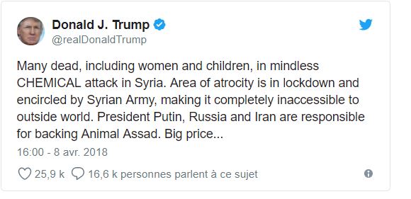 Στο Twitter ο αμερικανός πρόεδρος έγραψε “Πολλοί νεκροί συμπεριλαμβανομένων, γυναικόπαιδων, σε ανόητη χημική επίθεση στη Συρία. Η περιοχή της ακρότητας είναι κλειδωμένη και περικυκλωμένη από το συριακό στρατό ,καθιστώντας την ολοκληρωτικά απρόσιτη στον έξω κόσμο. Ο πρόεδρος Putin, η Ρωσία και το Ιράν ευθύνονται για την υποστήριξη στο ζώο Assad. Μεγάλο το τίμημα …..θα πληρώσεις.”